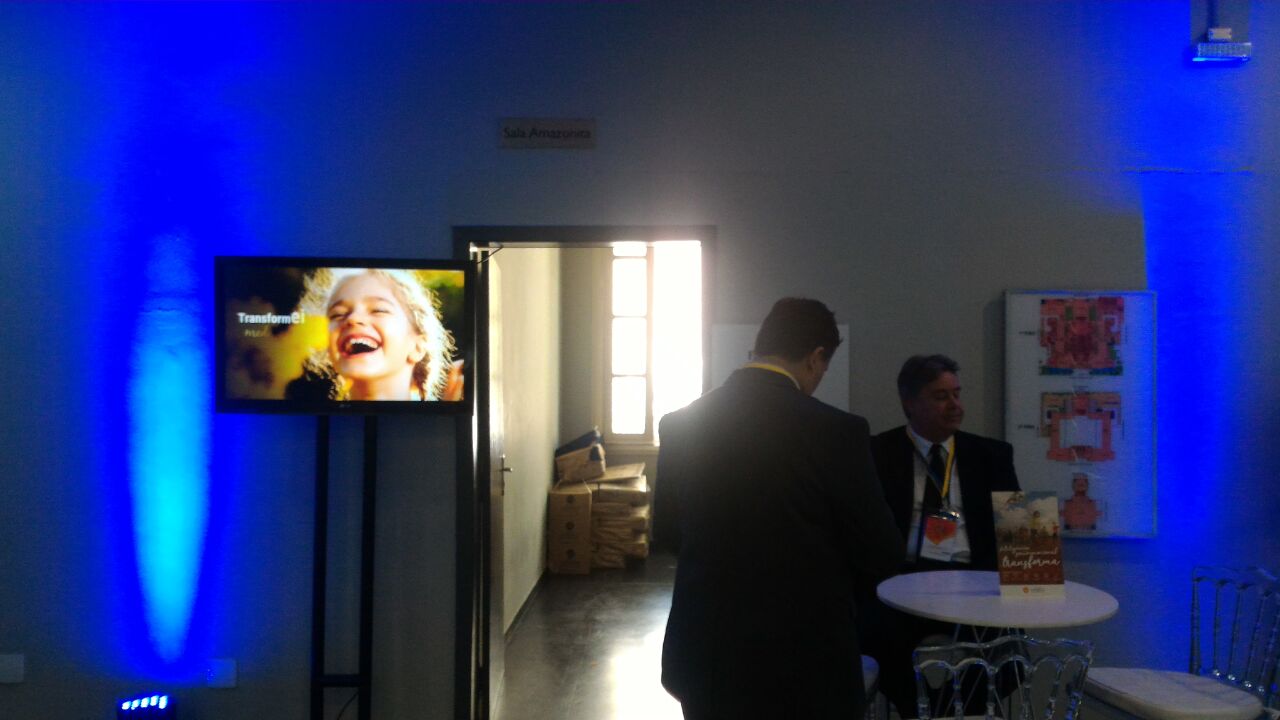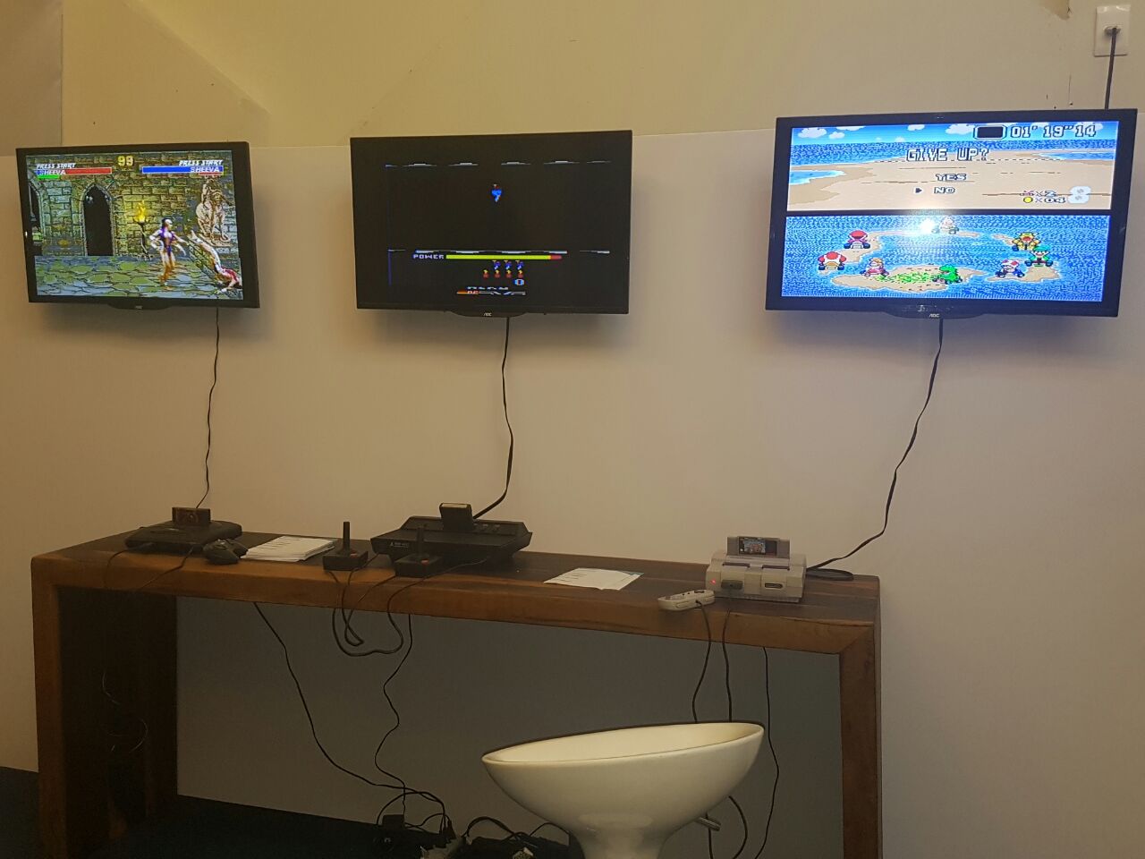 TV 32" LED para fixação em totem.TV 32" fixadas na parede em exposição de arte visual TV 32" fixadas para jogos com vídeo games.